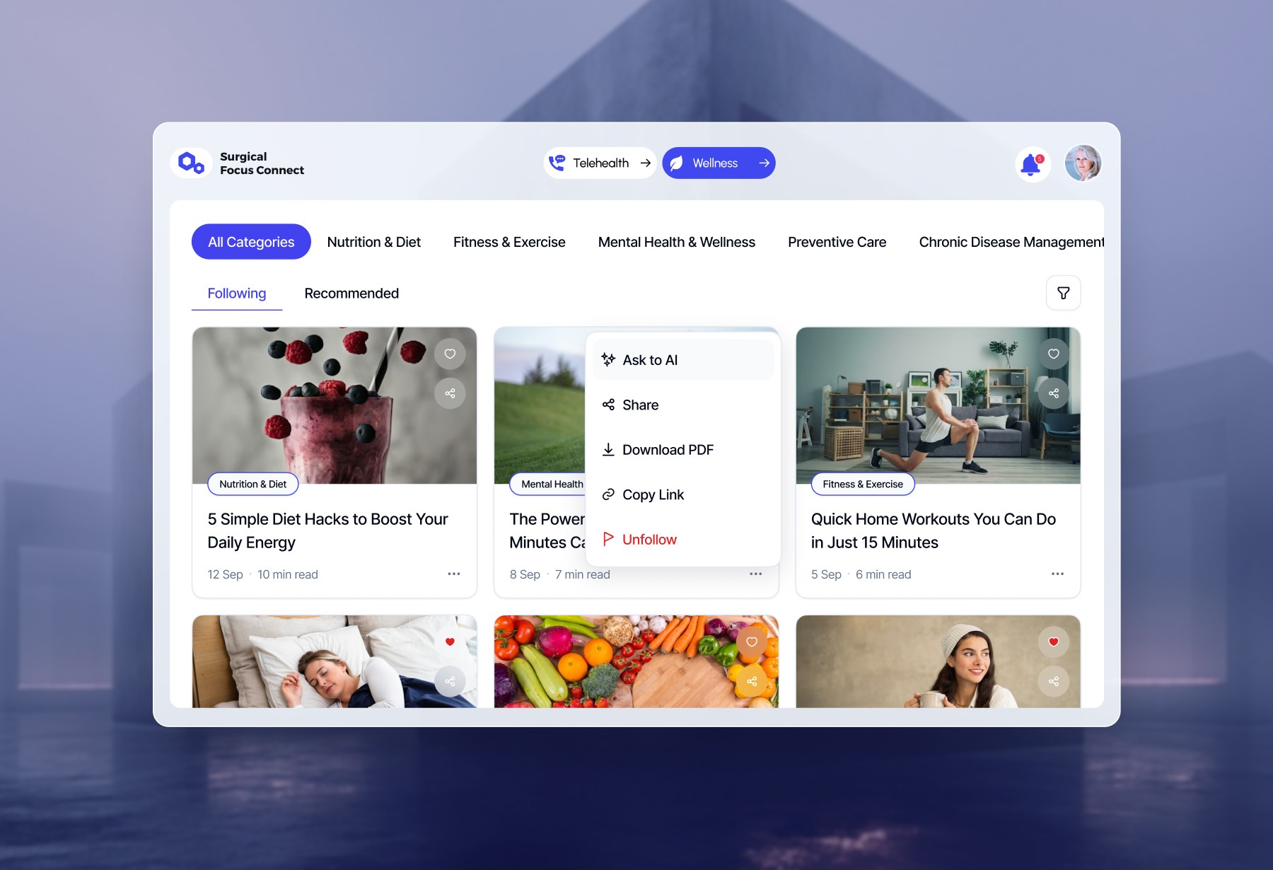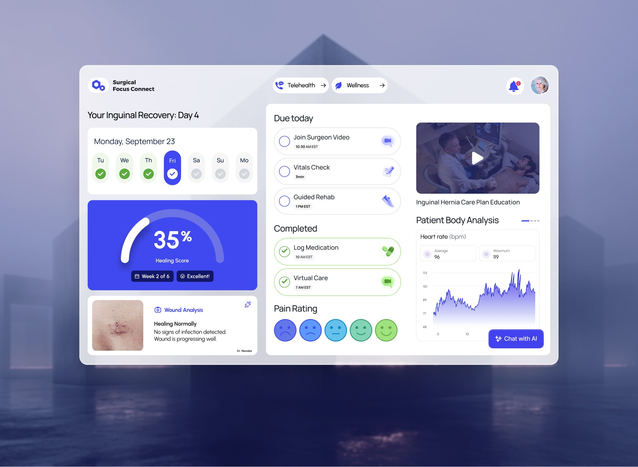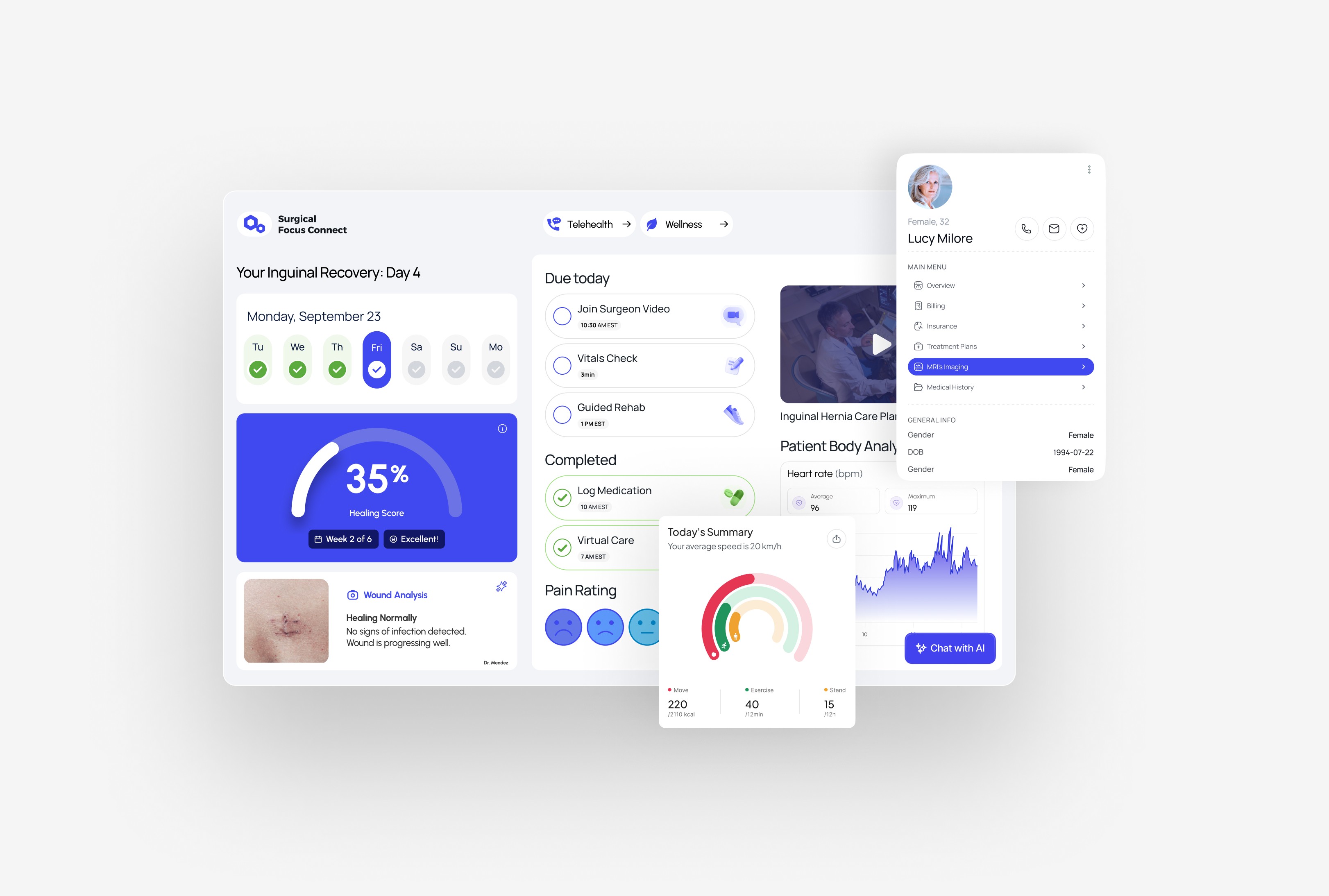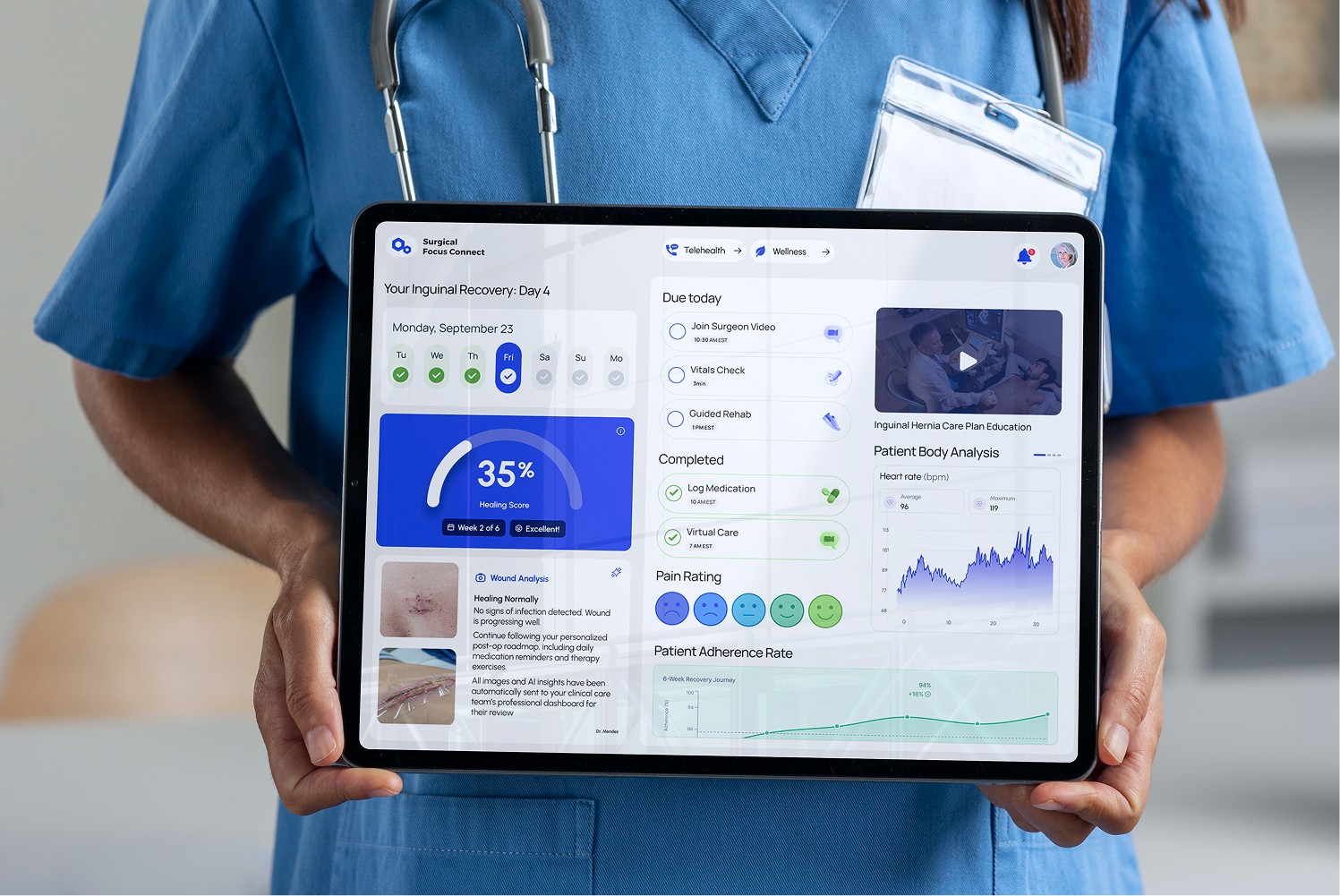 Surgical Focus provides an AI powered perioperative care platform licensed by hospitals. The strategic UX/UI overhaul redefined this B2B telehealth ecosystem, integrating AI diagnostics and digital therapy modules to seamlessly extend clinical care beyond the hospital stay.