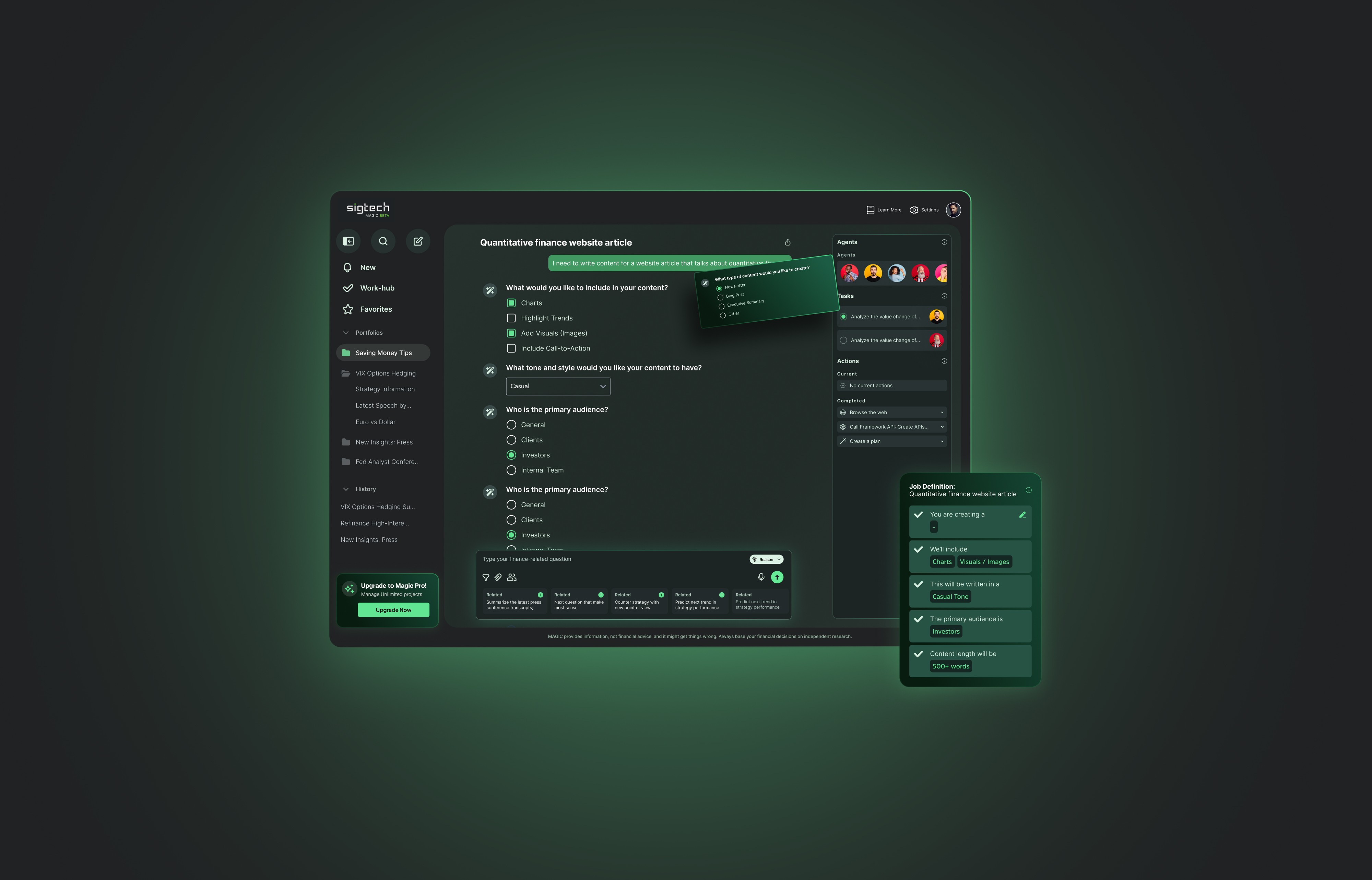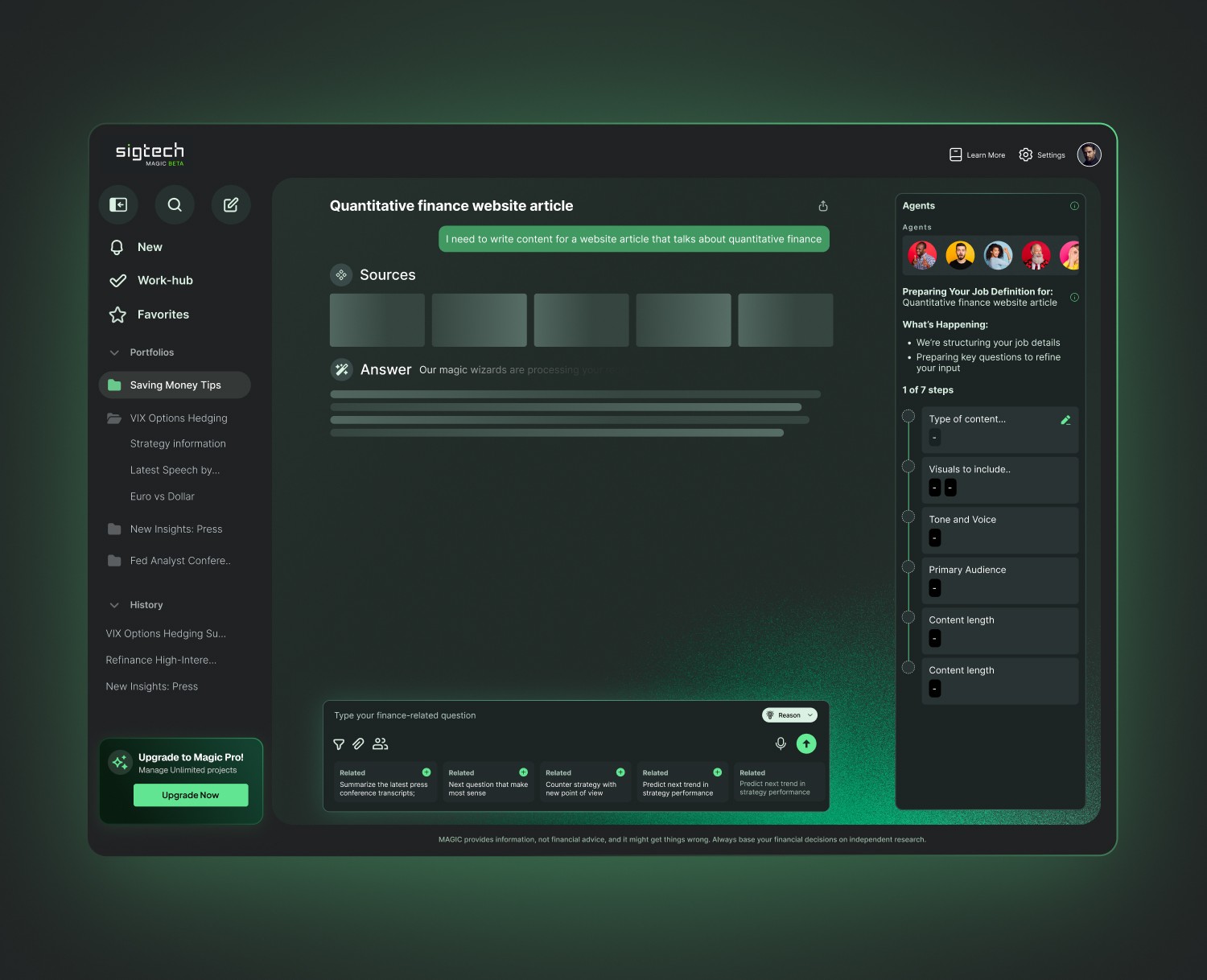 SigTech MAGIC is a B2B AI copilot platform that helps hedge funds and asset managers handle research, portfolio work, and compliance in a secure workspace. The project built the product from the ground up, using UX best practices and user research to define analyst jobs, design clear multi agent flows, and create an interface that builds trust and lets teams act faster.