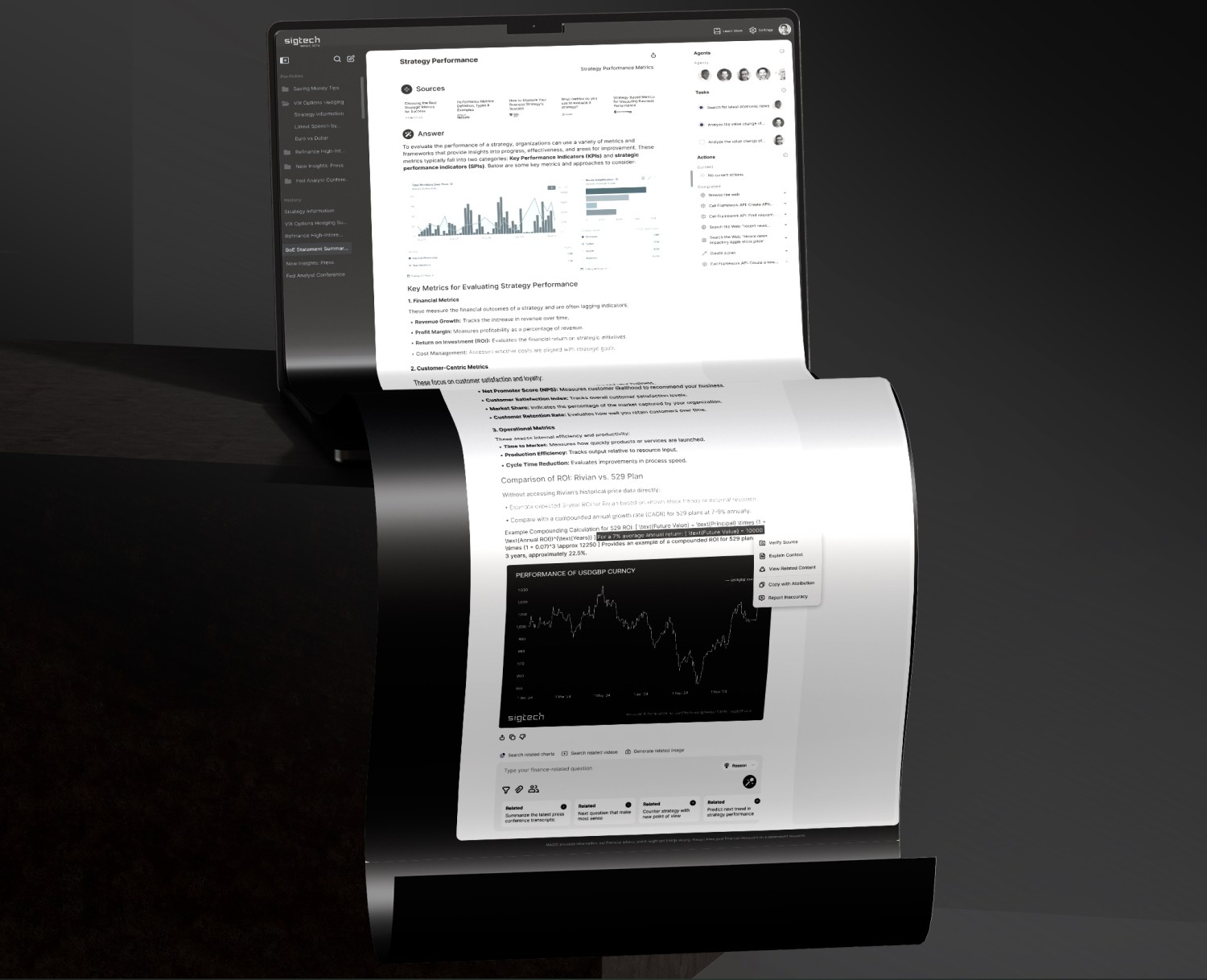 The core challenge for SigTech was to turn a powerful AI engine into a product analysts would actually trust and use. Hedge funds and asset managers needed a secure workspace that handled complex documents, explained AI outputs in plain language, and fit cleanly into their research, review, and reporting routines.